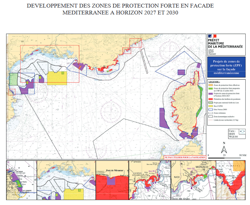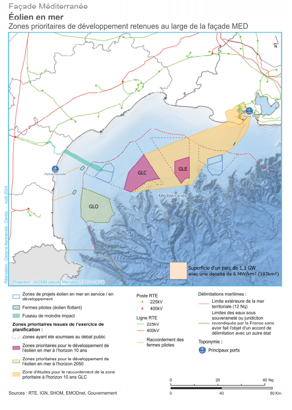 La planification de l'éolien en mer a fait l'objet d'un débat public sur les 4 façades maritimes hexagonales (dont la façade méditerranéenne) du 20 novembre 2023 au 26 avril 2024. Suite aux enseignements de ce débat, le Ministère du Partenariat avec les Territoires et de la Décentralisation et le Ministère de la Transition Ecologique, de l'Energie, du Climat et de la Prévention des Risques ont rendu publique le 17 octobre 2024 la mise à jour des objectifs et de la cartographie des zones de développement de l'éolien en mer ainsi que la cartographie des zones de protection forte.
